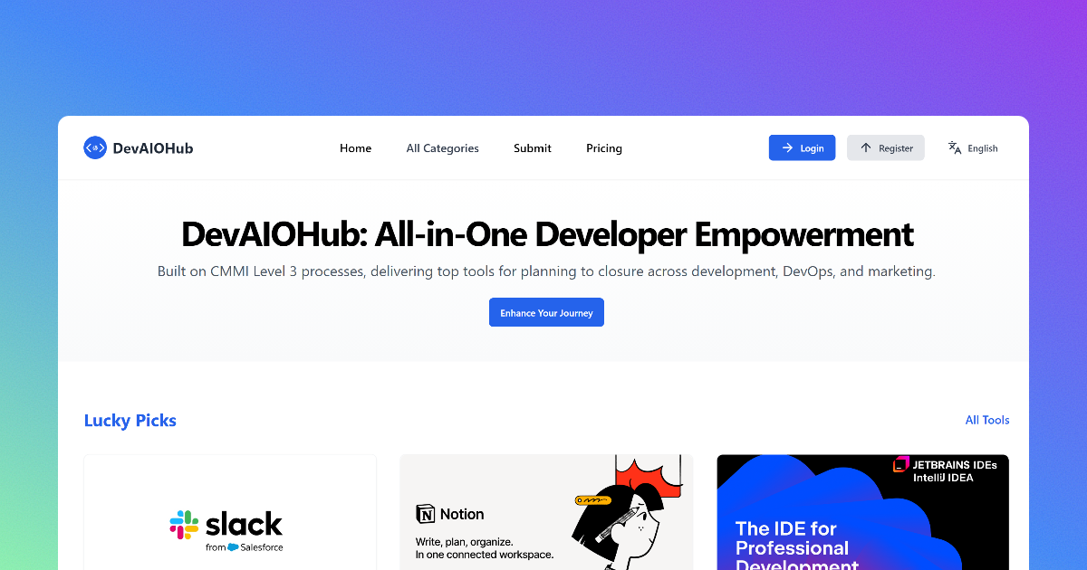 DevAIOHub uses CMMI Level 3 to offer top tools for planning to closure, spanning development, DevOps, and marketing in one navigation hub.