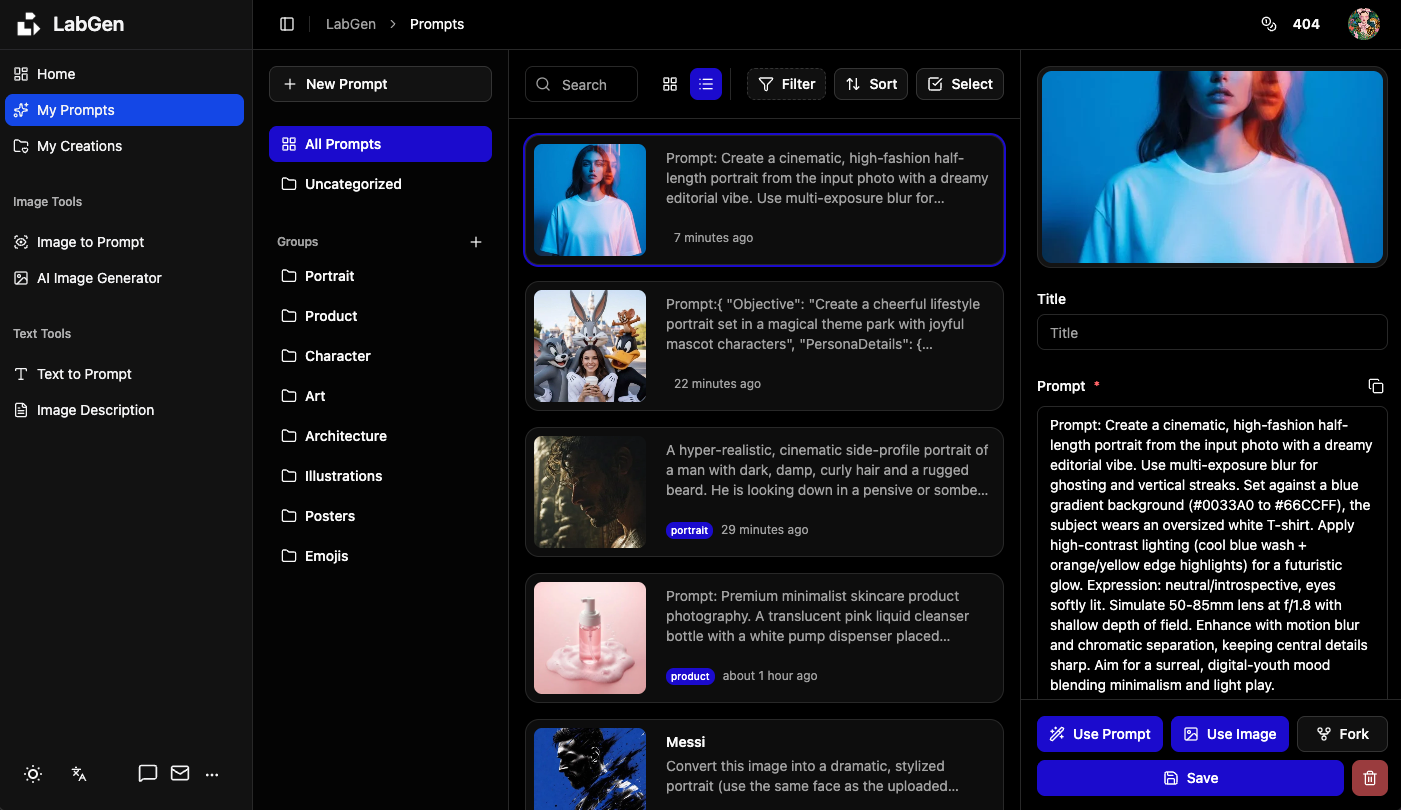LabGen is an AI-powered toolkit for creators to generate, manage, and reuse prompts from images â and turn ideas into visual content faster.