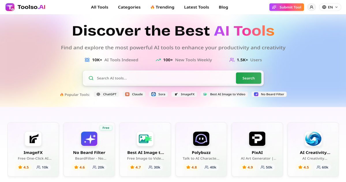 Discover the best AI tools for your needs. Toolso.AI is a comprehensive directory of AI tools, updated daily with the latest innovations in artificial intelligence.